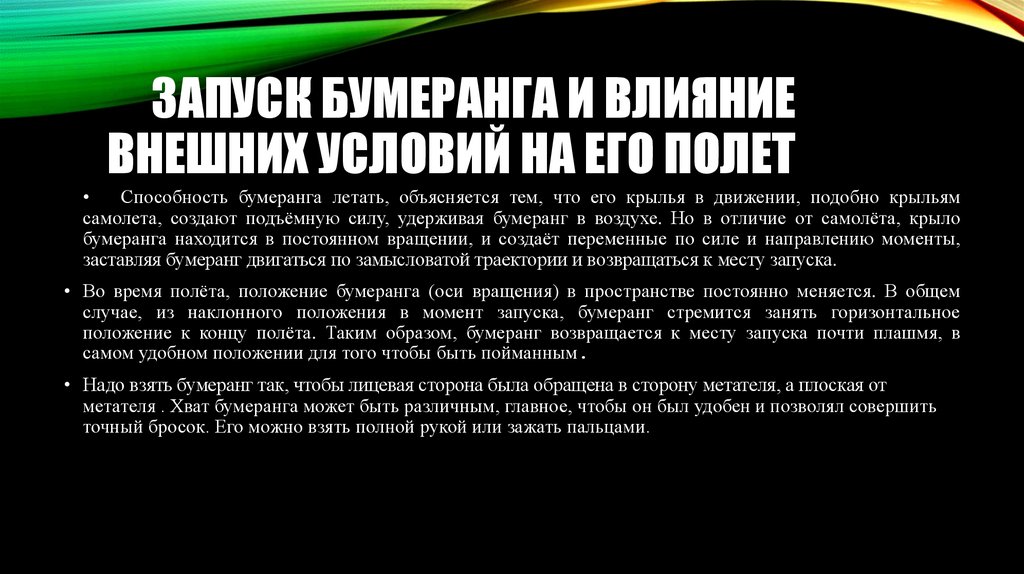 ЗАПУСК БУМЕРАНГА И ВЛИЯНИЕВНЕШНИХ УСЛОВИЙ НА ЕГО ПОЛЕТ