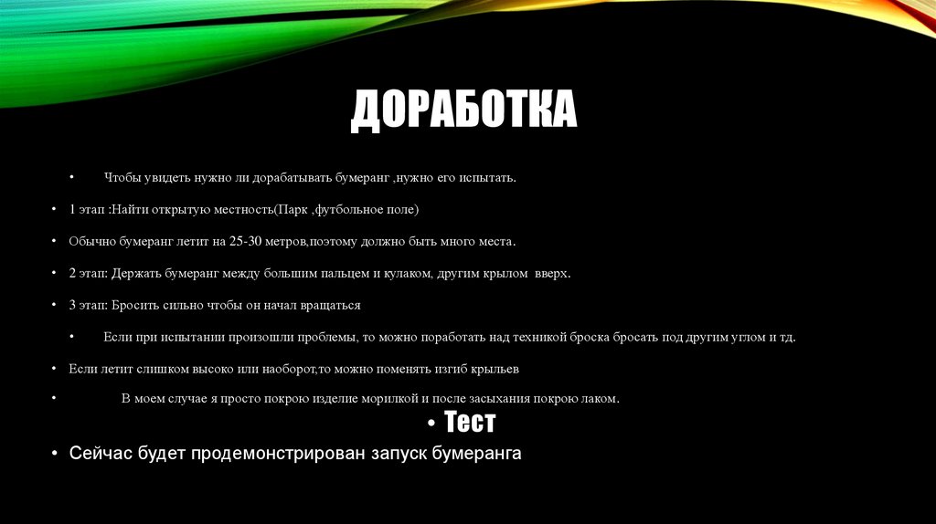 ДОРАБОТКАЧтобы увидеть нужно ли дорабатывать бумеранг ,нужно его испытать.