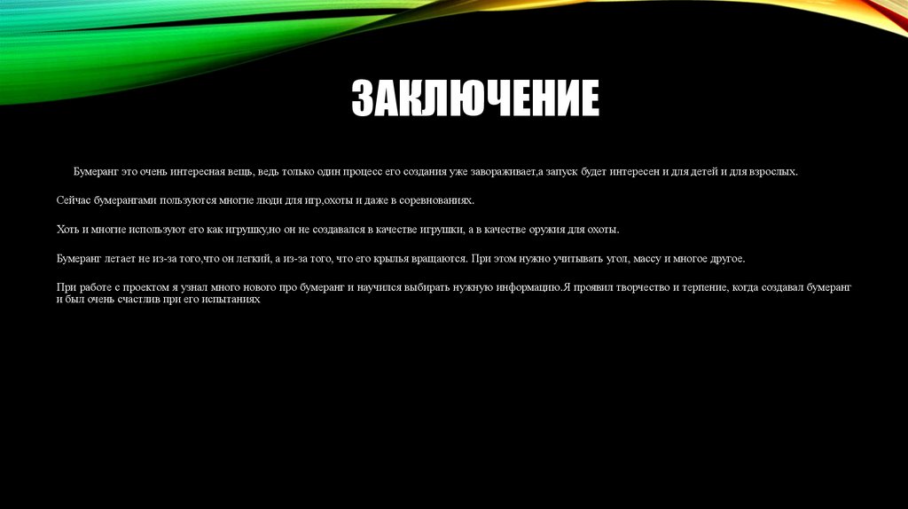 При работе с проектом я узнал много нового про бумеранг и научился выбирать нужную информацию.Я проявил творчество и терпение, когда создавал бумеранг