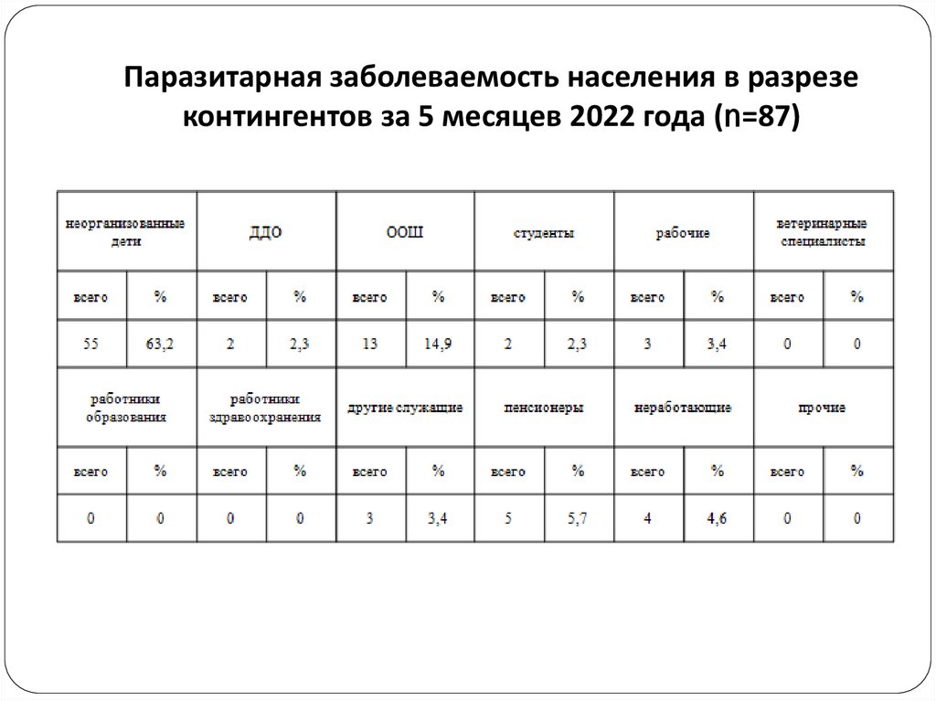 Паразитарная заболеваемость населения в разрезеконтингентов за 5 месяцев 2022 года (n=87)