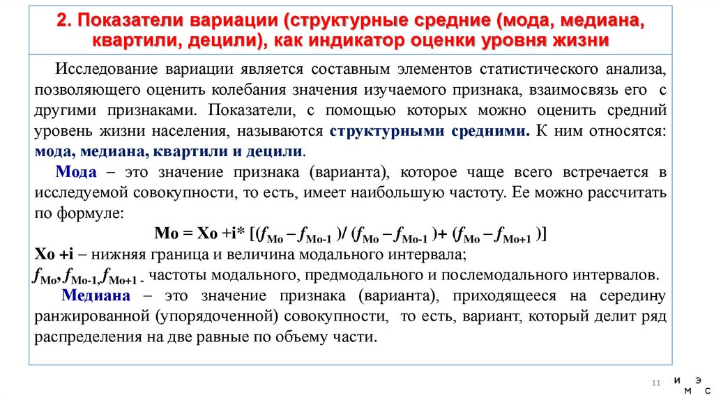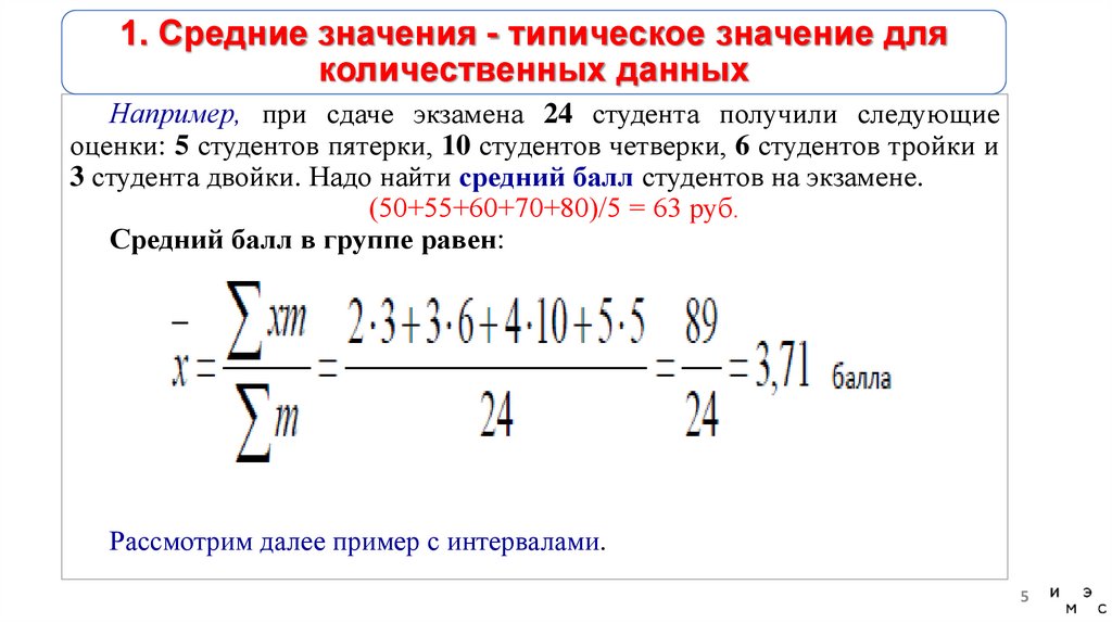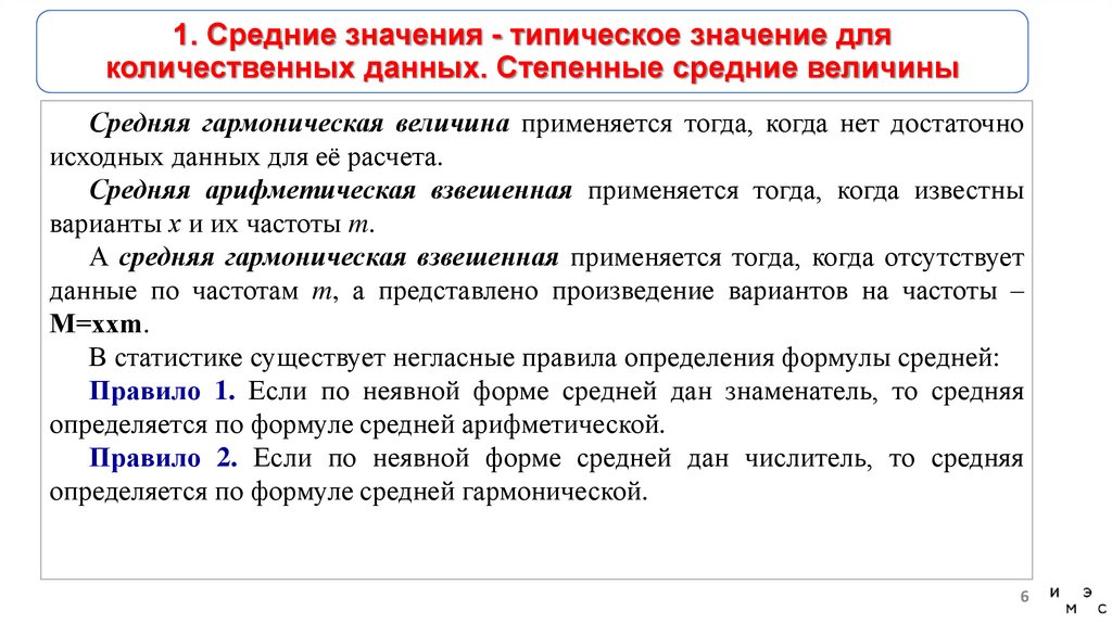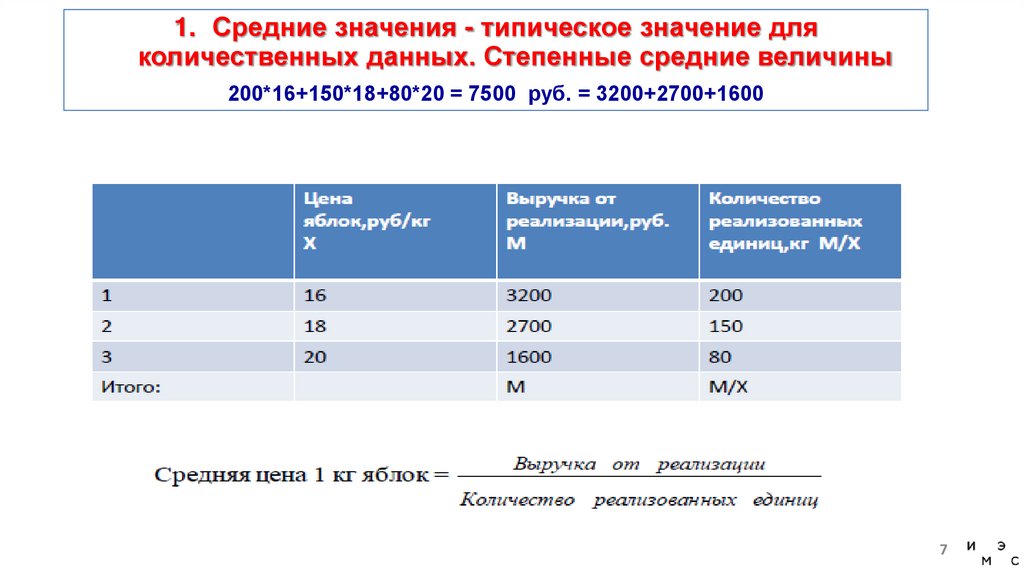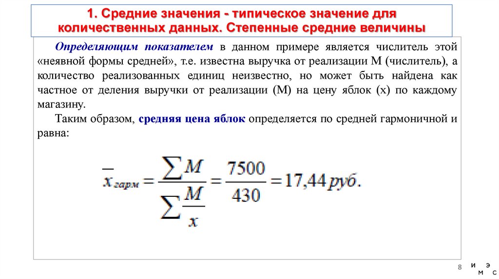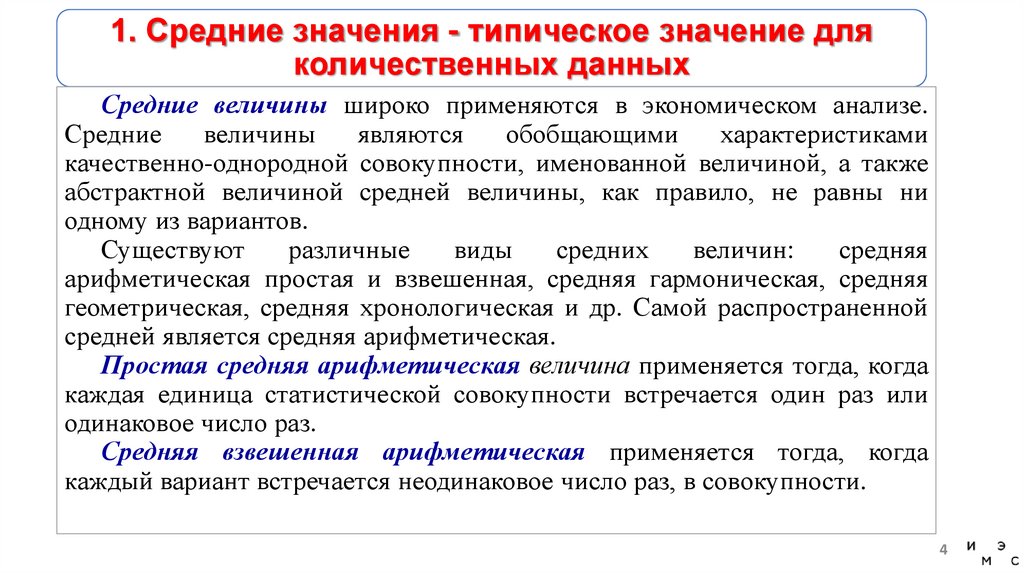 1. Средние значения - типическое значение дляколичественных данных. Степенные средние величины