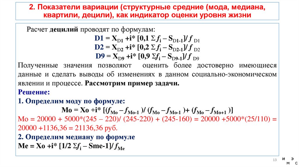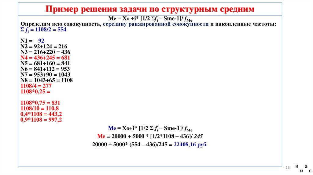Пример решения задачи по структурным среднимМе = Хо +i* [1/2 Σfi – Sme-1]/ fMе