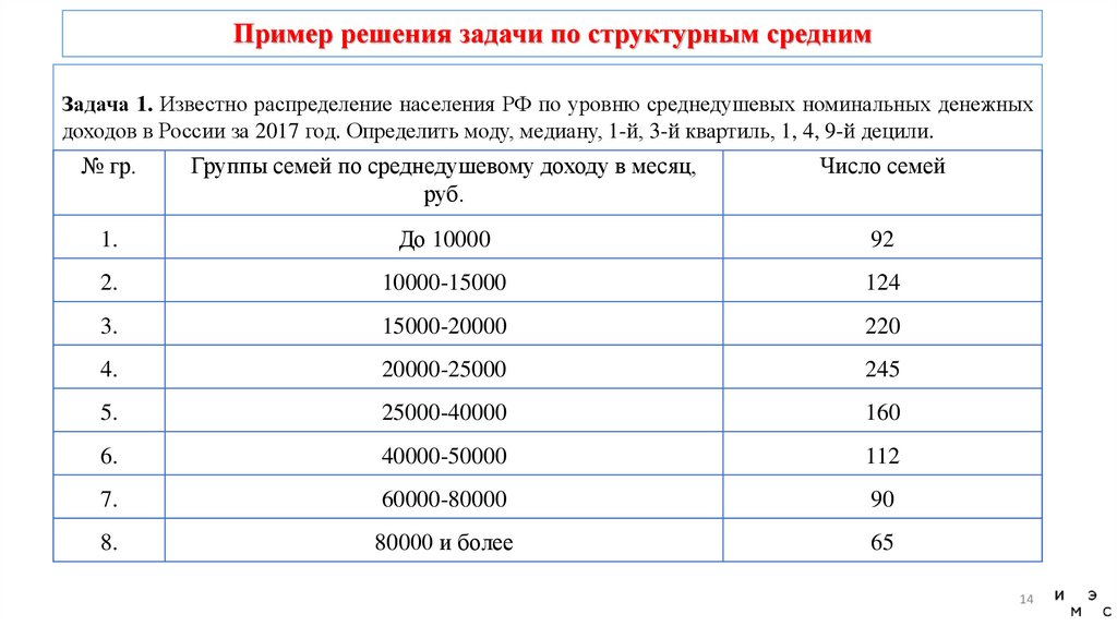 Пример решения задачи по структурным среднимЗадача 1. Известно распределение населения РФ по уровню среднедушевых номинальных денежных