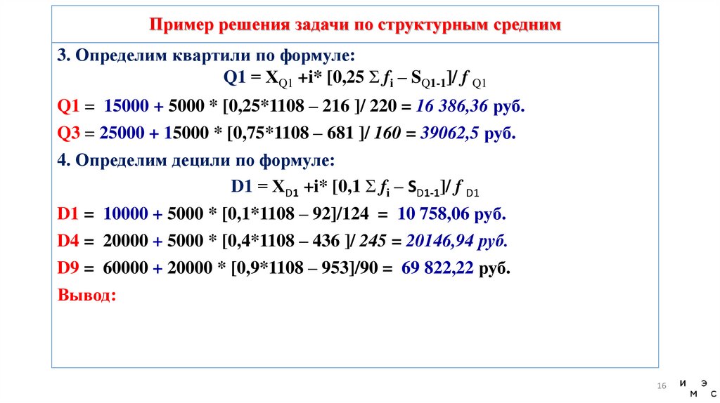 Пример решения задачи по структурным средним3. Определим квартили по формуле: