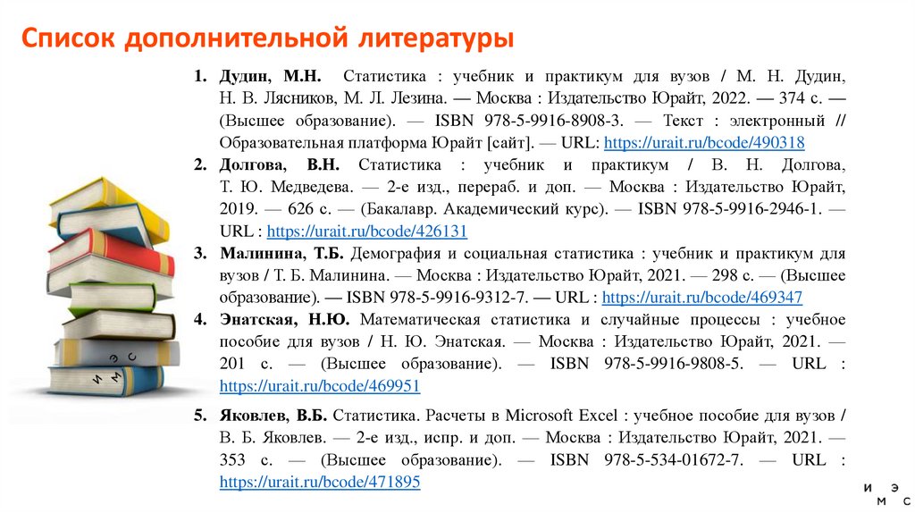 Список дополнительной литературы1. Дудин, М.Н. Статистика : учебник и практикум для вузов / М. Н. Дудин,