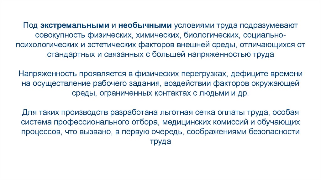 Под экстремальными и необычными условиями труда подразумеваютсовокупность физических, химических, биологических, социальнопсихологических и эстетических факторов внешней среды, отличающихся от