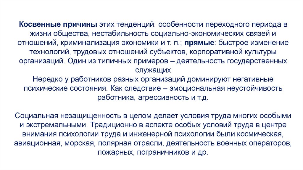 Косвенные причины этих тенденций: особенности переходного периода вжизни общества, нестабильность социально-экономических связей и