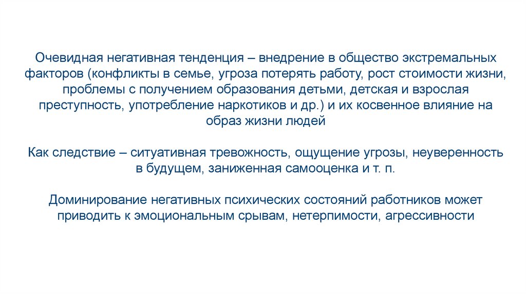 Очевидная негативная тенденция – внедрение в общество экстремальныхфакторов (конфликты в семье, угроза потерять работу, рост стоимости жизни,