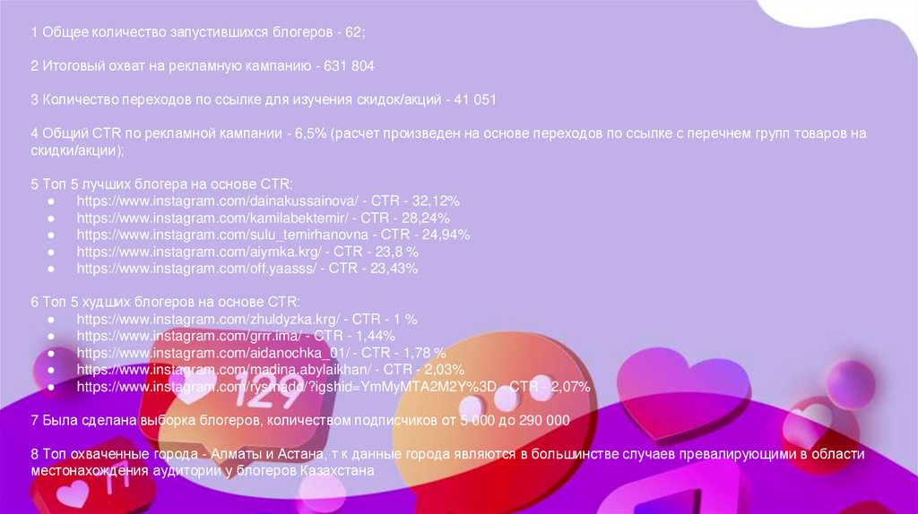 1 Общее количество запустившихся блогеров - 62;2 Итоговый охват на рекламную кампанию - 631 804