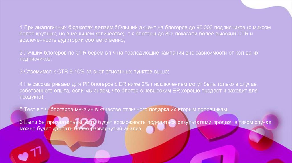 1 При аналогичных бюджетах делаем бОльший акцент на блогеров до 90 000 подписчиков (с миксомболее крупных, но в меньшем количестве), т к блогеры до 80к показали более высокий CTR и