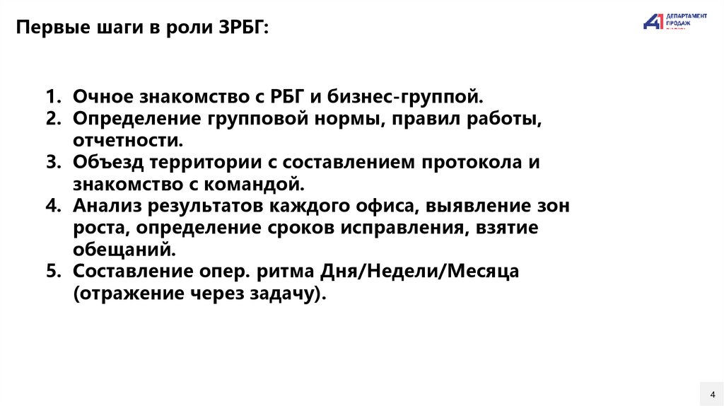 Первые шаги в роли ЗРБГ:1. Очное знакомство с РБГ и бизнес-группой.