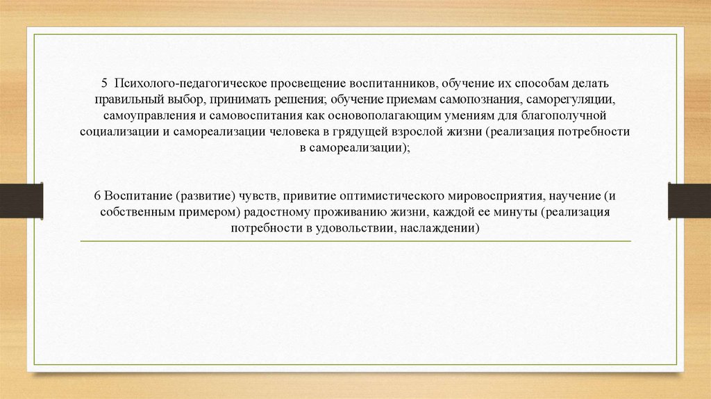 5 Психолого-педагогическое просвещение воспитанников, обучение их способам делатьправильный выбор, принимать решения; обучение приемам самопознания, саморегуляции,
