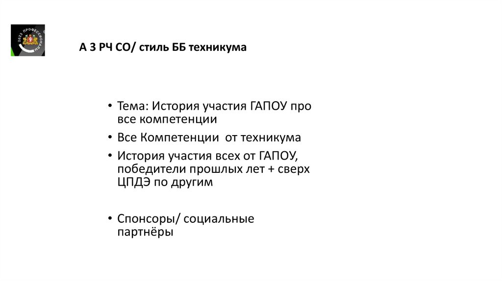 А 3 РЧ СО/ стиль ББ техникума• Тема: История участия ГАПОУ про