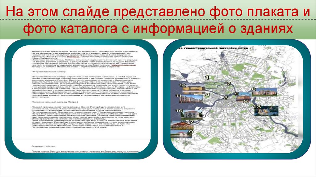 На этом слайде представлено фото плаката ифото каталога с информацией о зданиях