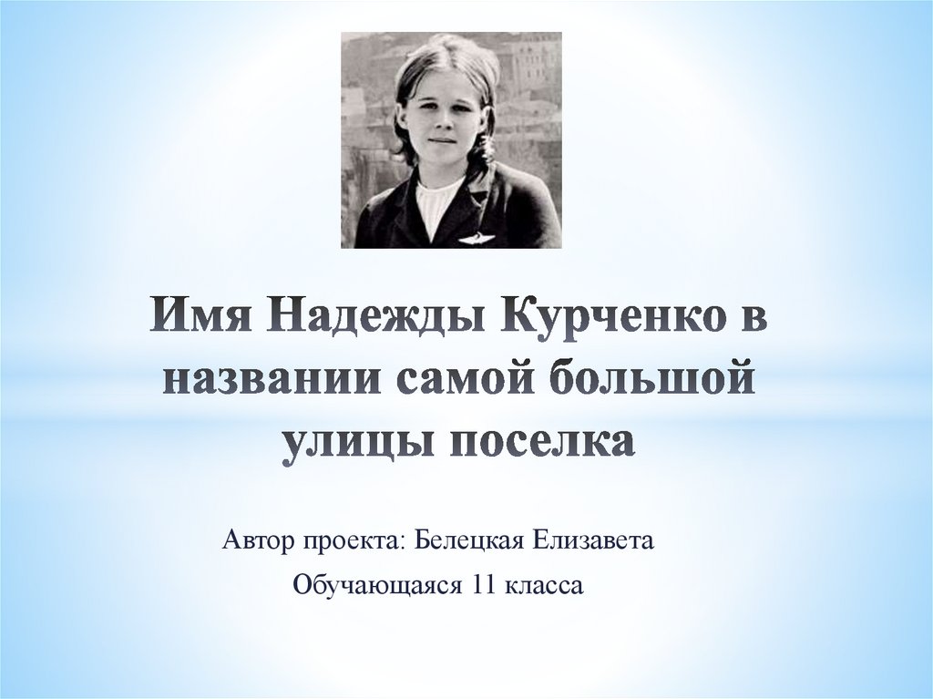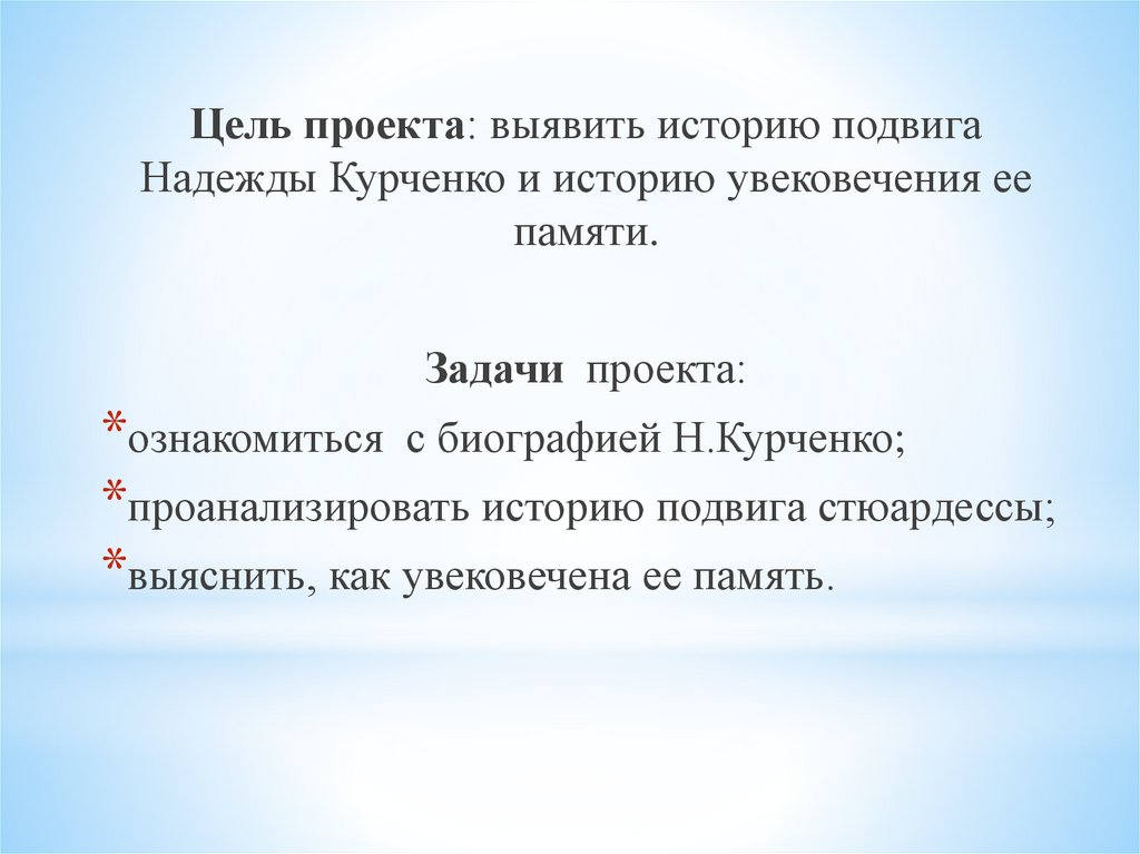 Цель проекта: выявить историю подвигаНадежды Курченко и историю увековечения ее