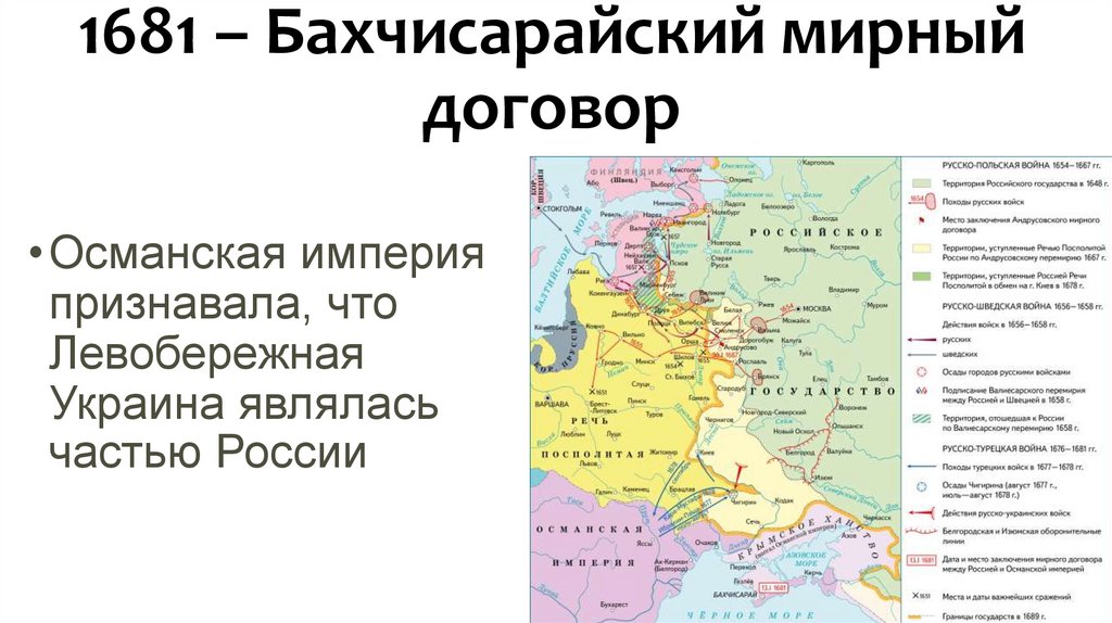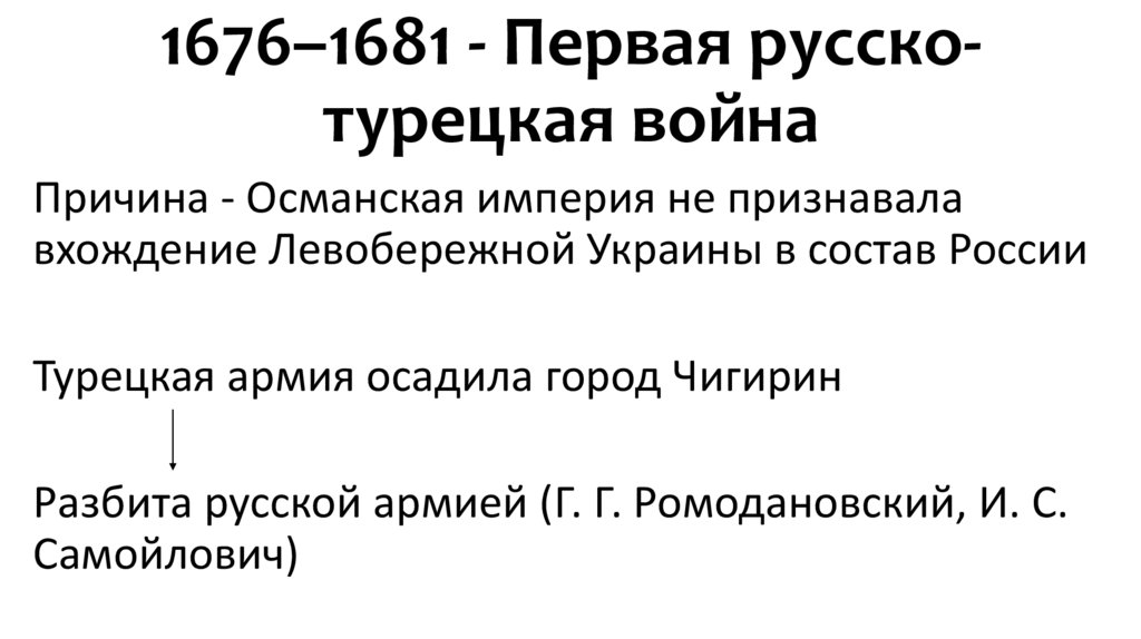 1676–1681 - Первая русскотурецкая войнаПричина - Османская империя не признавала