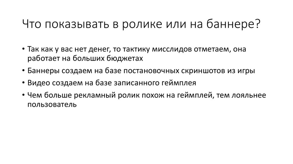 Что показывать в ролике или на баннере?• Так как у вас нет денег, то тактику мисслидов отметаем, она
