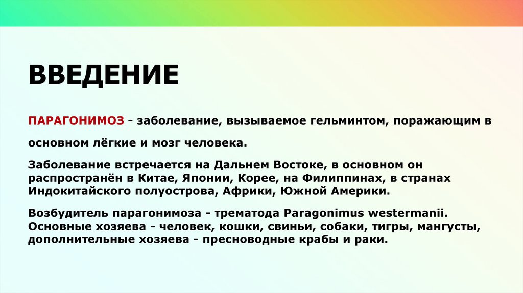 ВВЕДЕНИЕПАРАГОНИМОЗ - заболевание, вызываемое гельминтом, поражающим в