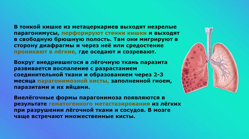 В тонкой кишке из метацеркариев выходят незрелыепарагонимусы, перфорируют стенки кишки и выходят