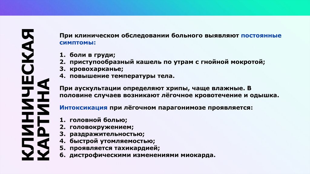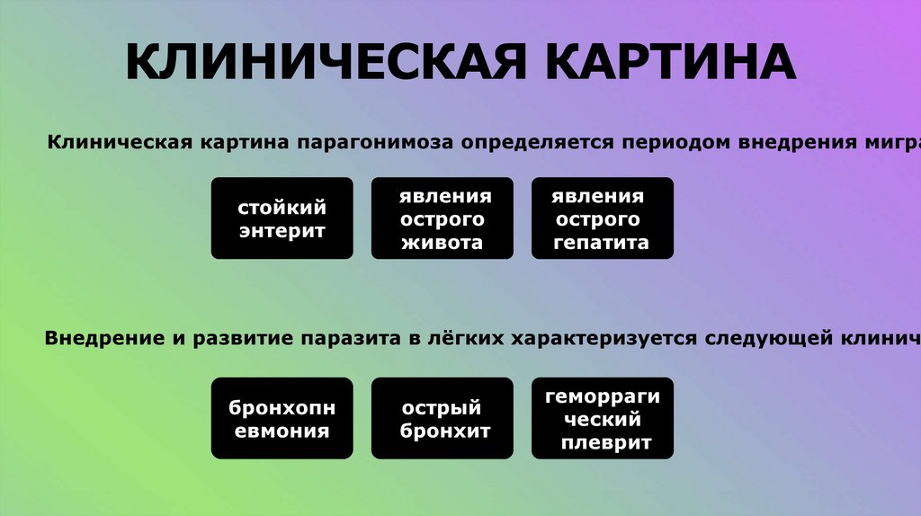 КЛИНИЧЕСКАЯ КАРТИНАКлиническая картина парагонимоза определяется периодом внедрения мигра
