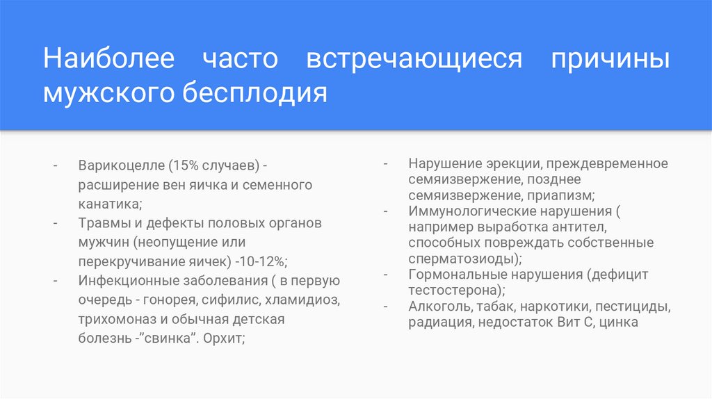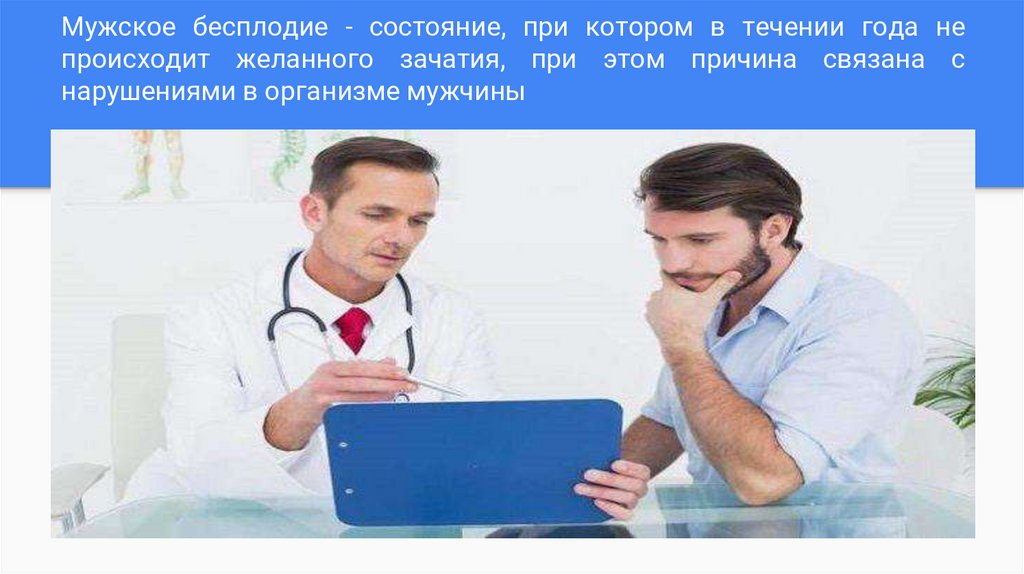 Мужское бесплодие - состояние, при котором в течении года непроисходит желанного зачатия, при этом причина связана с