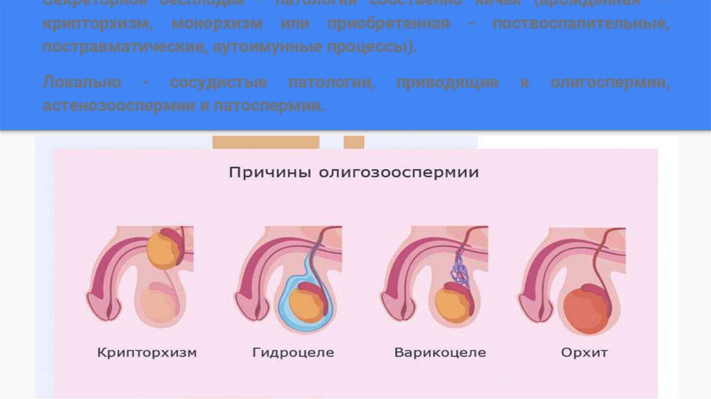 Секреторное бесплодие - патология собственно яичек (врожденная крипторхизм, монорхизм или приобретенная - поствоспалительные,постравматические, аутоимунные процессы).