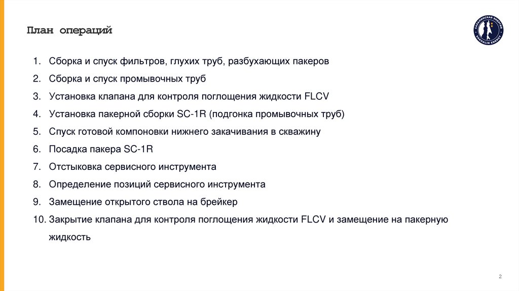 План операций1. Сборка и спуск фильтров, глухих труб, разбухающих пакеров