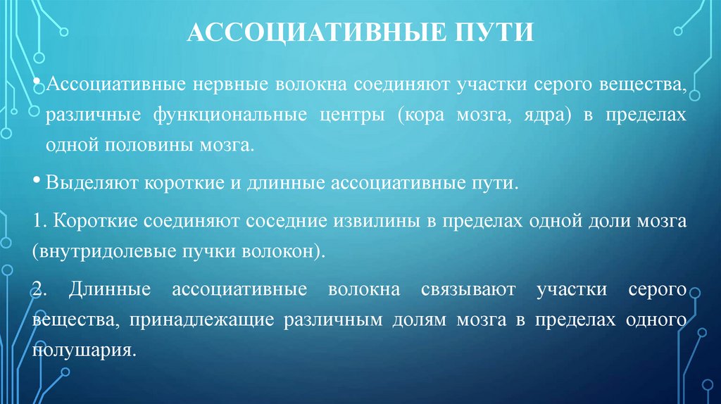 АССОЦИАТИВНЫЕ ПУТИ• Ассоциативные нервные волокна соединяют участки серого вещества,