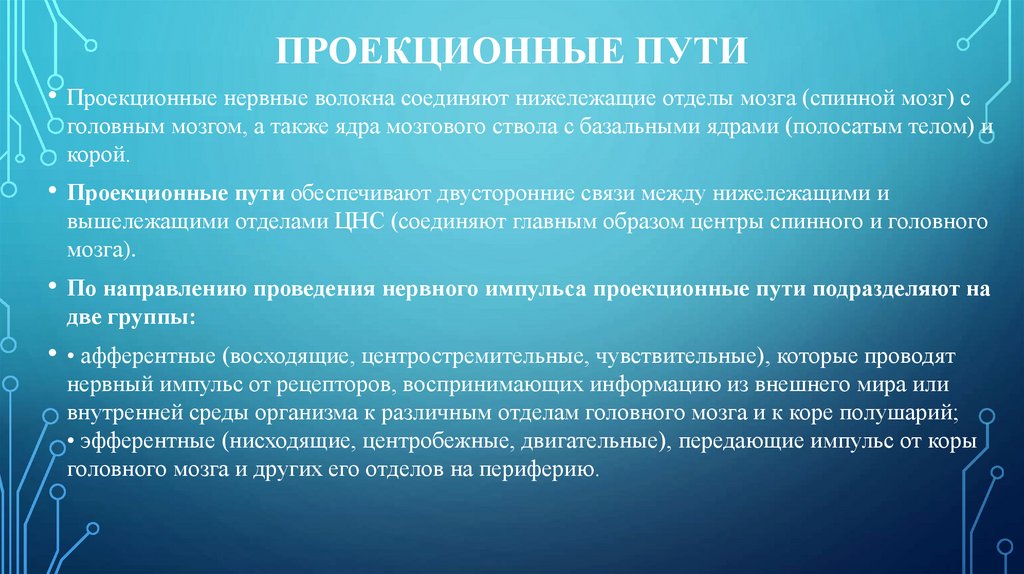 • Проекционные пути обеспечивают двусторонние связи между нижележащими и