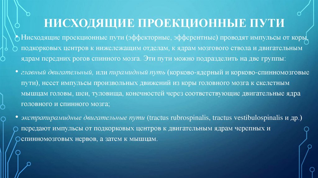 НИСХОДЯЩИЕ ПРОЕКЦИОННЫЕ ПУТИ• Нисходящие проекционные пути (эффекторные, эфферентные) проводят импульсы от коры,