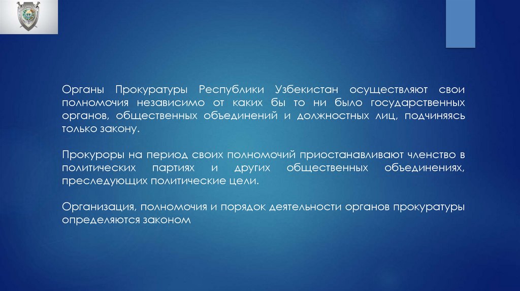 Органы Прокуратуры Республики Узбекистан осуществляют своиполномочия независимо от каких бы то ни было государственных