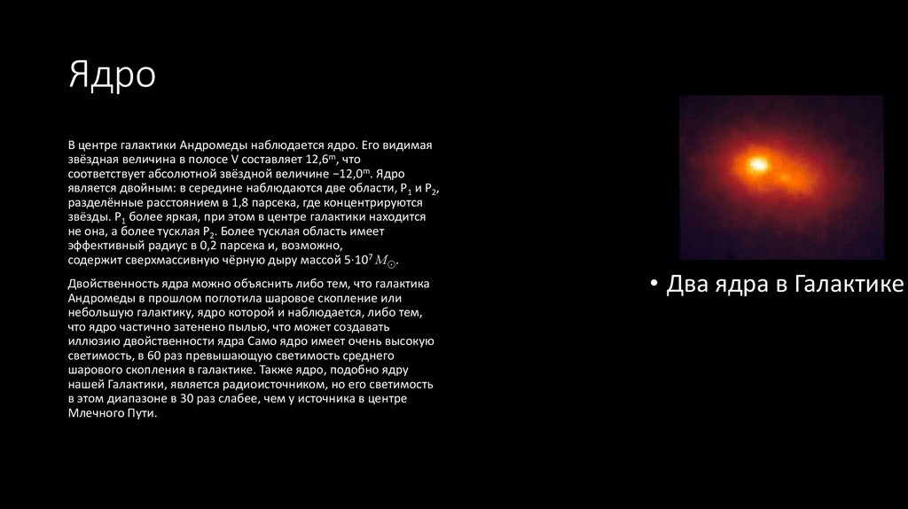 ЯдроВ центре галактики Андромеды наблюдается ядро. Его видимая
