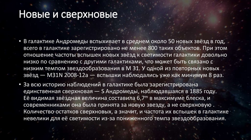Новые и сверхновые• В галактике Андромеды вспыхивает в среднем около 50 новых звёзд в год,