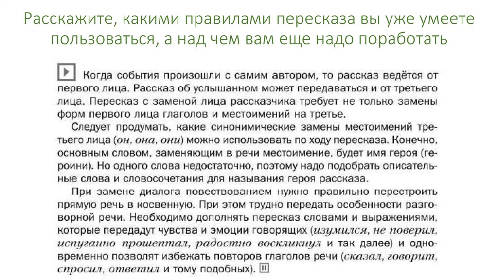 Расскажите, какими правилами пересказа вы уже умеетепользоваться, а над чем вам еще надо поработать