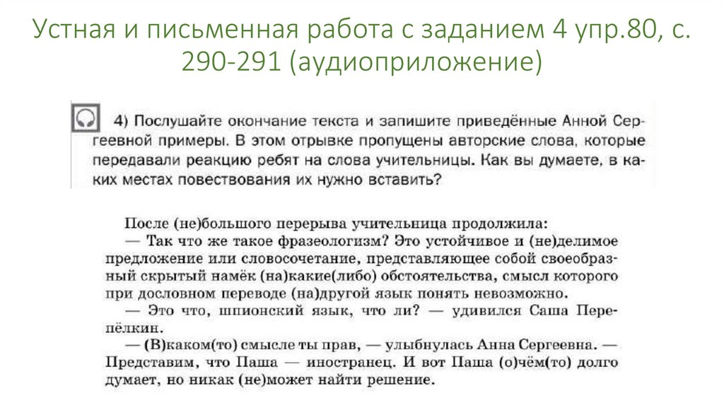 Устная и письменная работа с заданием 4 упр.80, с.290-291 (аудиоприложение)