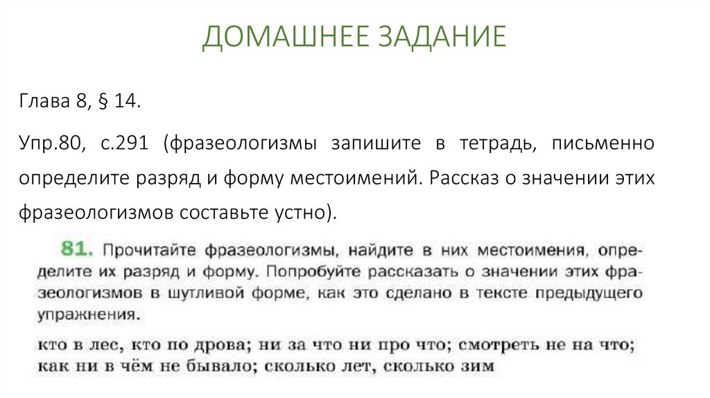 Упр.80, с.291 (фразеологизмы запишите в тетрадь, письменно