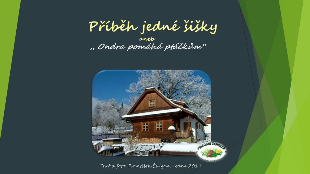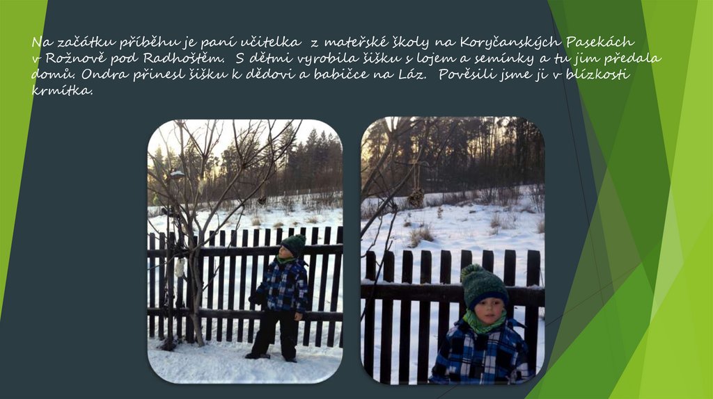 Na začátku příběhu je paní učitelka z mateřské školy na Koryčanských Pasekáchv Rožnově pod Radhoštěm. S dětmi vyrobila šišku s lojem a semínky a tu jim předala