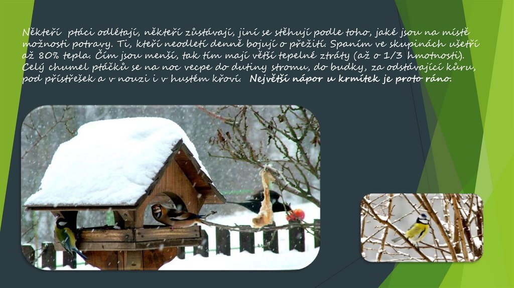 Někteří ptáci odlétají, někteří zůstávají, jiní se stěhují podle toho, jaké jsou na místěmožnosti potravy. Ti, kteří neodletí denně bojují o přežití. Spaním ve skupinách ušetří
