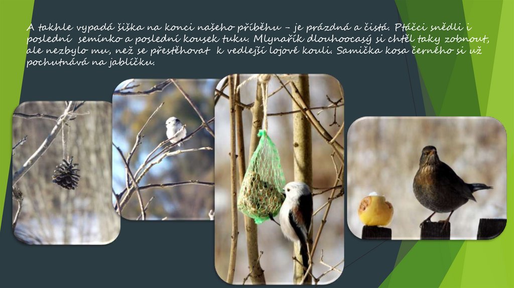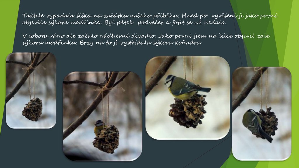 A tímto náš příběh jedné šišky končí. Sýkora modřinka na krmítku už vyhlíží Ondru,kdy přinese ze školky další šišku.