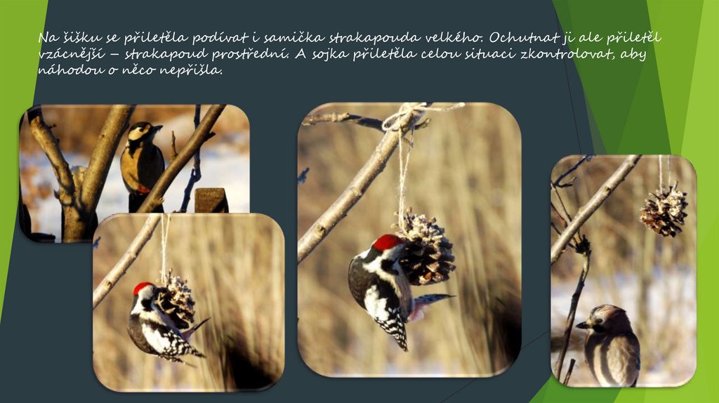 Na šišku se přiletěla podívat i samička strakapouda velkého. Ochutnat ji ale přiletělvzácnější – strakapoud prostřední. A sojka přiletěla celou situaci zkontrolovat, aby