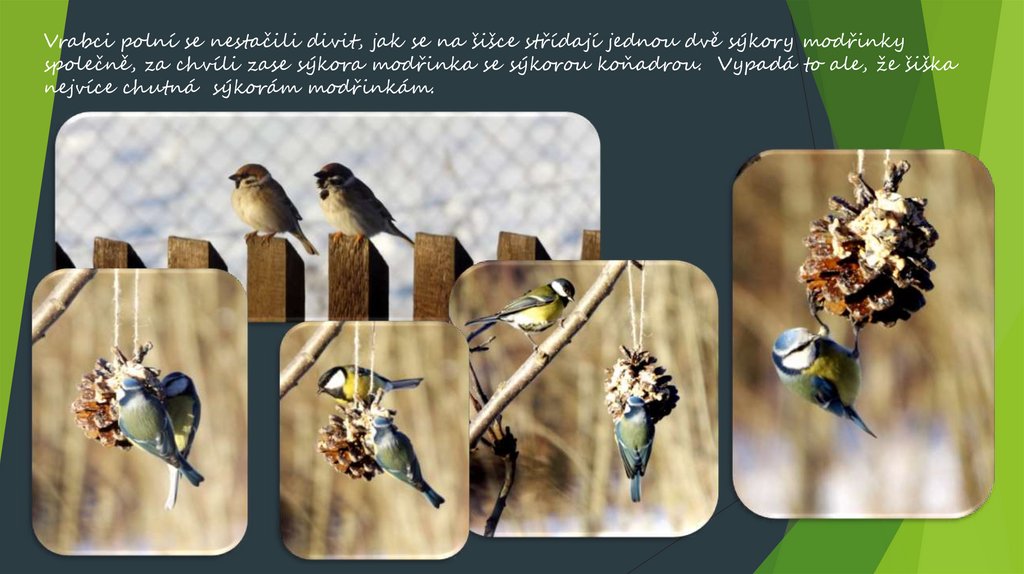Vrabci polní se nestačili divit, jak se na šišce střídají jednou dvě sýkory modřinkyspolečně, za chvíli zase sýkora modřinka se sýkorou koňadrou. Vypadá to ale, že šiška