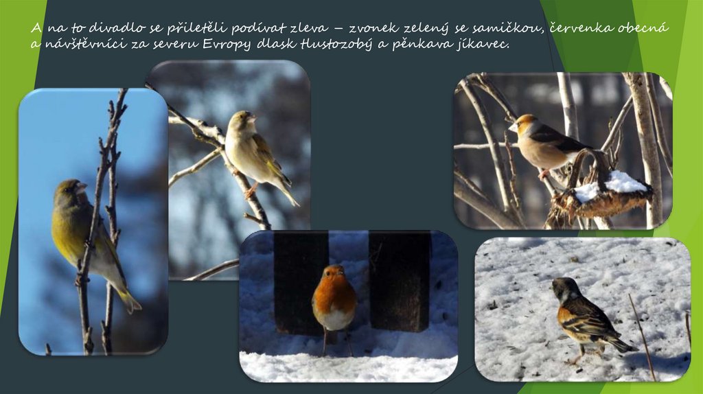 A na to divadlo se přiletěli podívat zleva – zvonek zelený se samičkou, červenka obecnáa návštěvníci za severu Evropy dlask tlustozobý a pěnkava jíkavec.