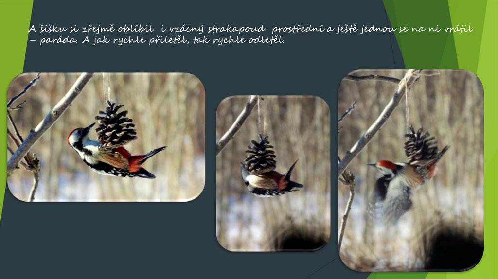 A šišku si zřejmě oblíbil i vzácný strakapoud prostřední a ještě jednou se na ni vrátil– paráda. A jak rychle přiletěl, tak rychle odletěl.