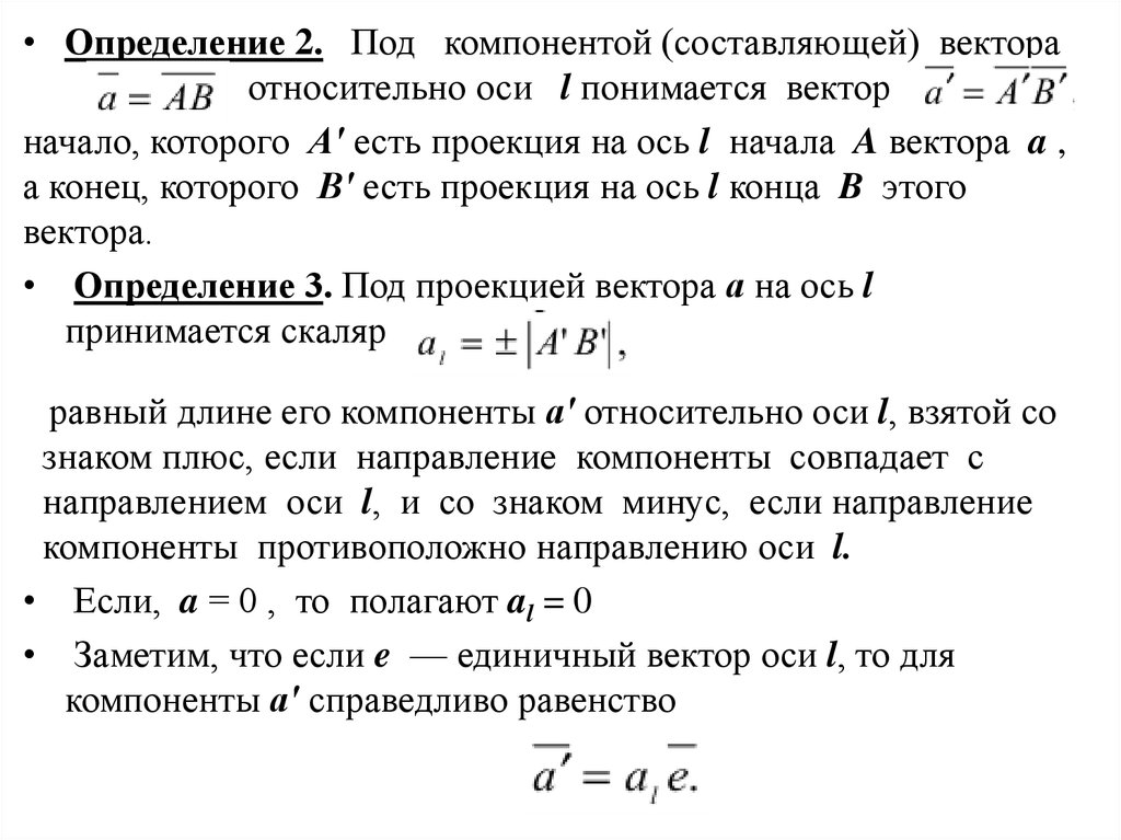 • Определение 2. Под компонентой (cоставляющей) вектораотносительно оси l понимается вектор
