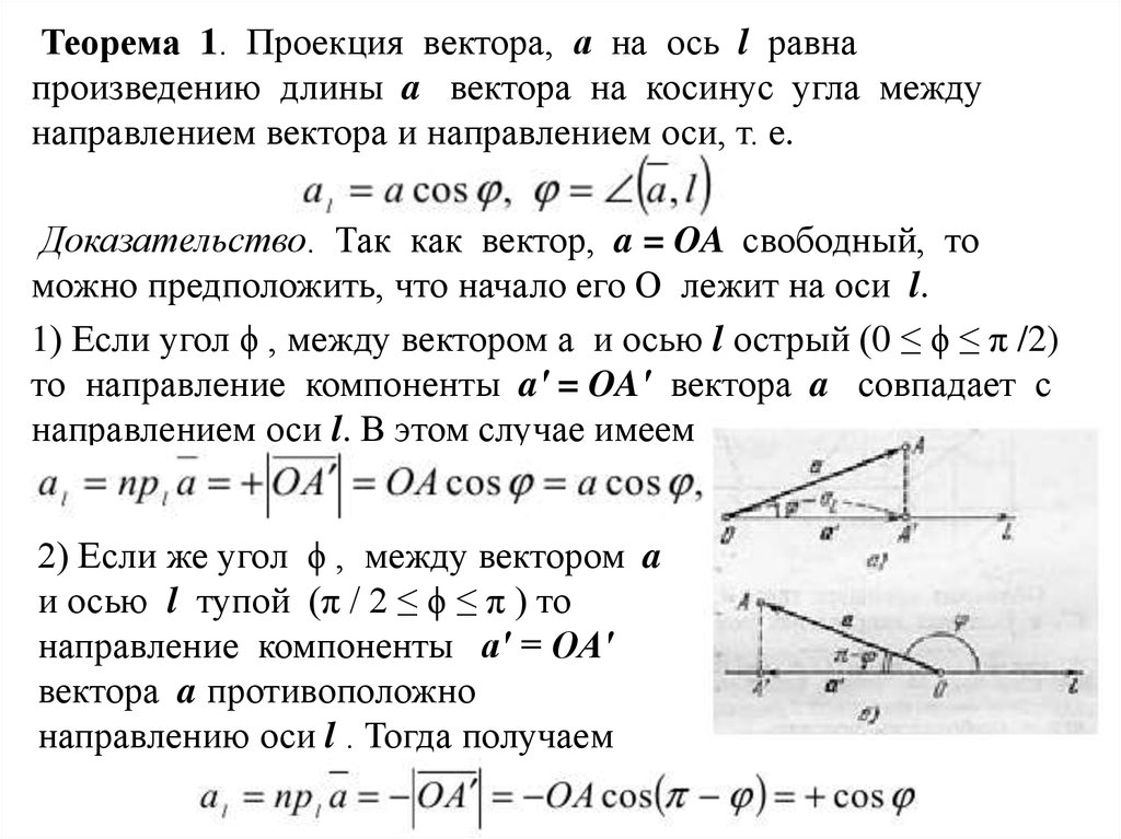 Теорема 1. Проекция вектора, а на ось l равнапроизведению длины a вектора на косинус угла между