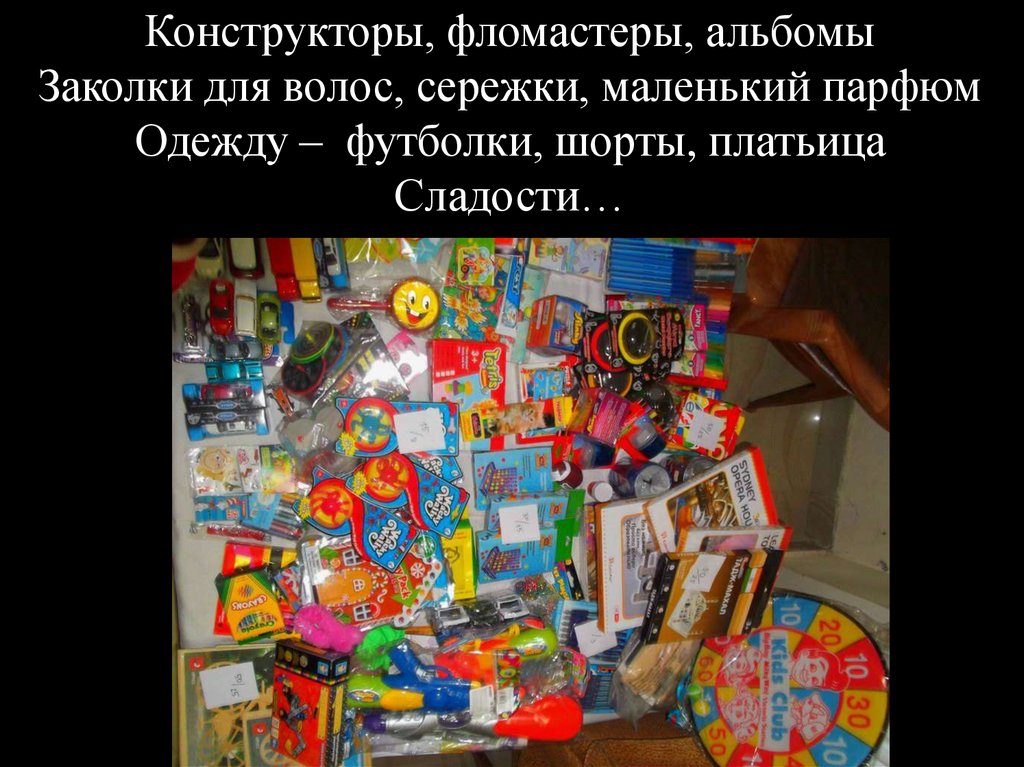 Конструкторы, фломастеры, альбомыЗаколки для волос, сережки, маленький парфюм