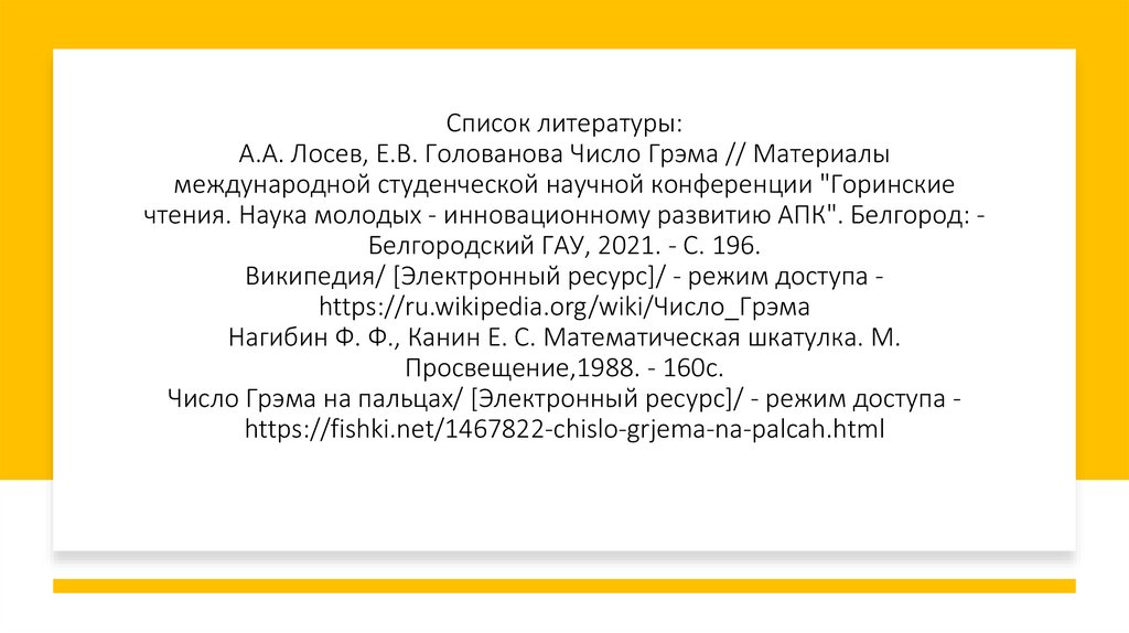 Список литературы:А.А. Лосев, Е.В. Голованова Число Грэма // Материалы