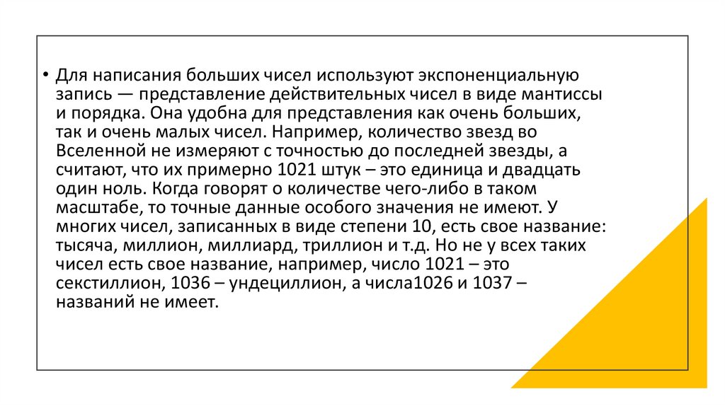 • Для написания больших чисел используют экспоненциальнуюзапись — представление действительных чисел в виде мантиссы