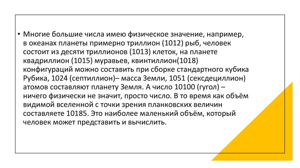 • Многие большие числа имею физическое значение, например,в океанах планеты примерно триллион (1012) рыб, человек