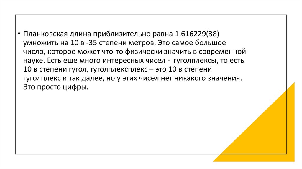 • Планковская длина приблизительно равна 1,616229(38)умножить на 10 в -35 степени метров. Это самое большое